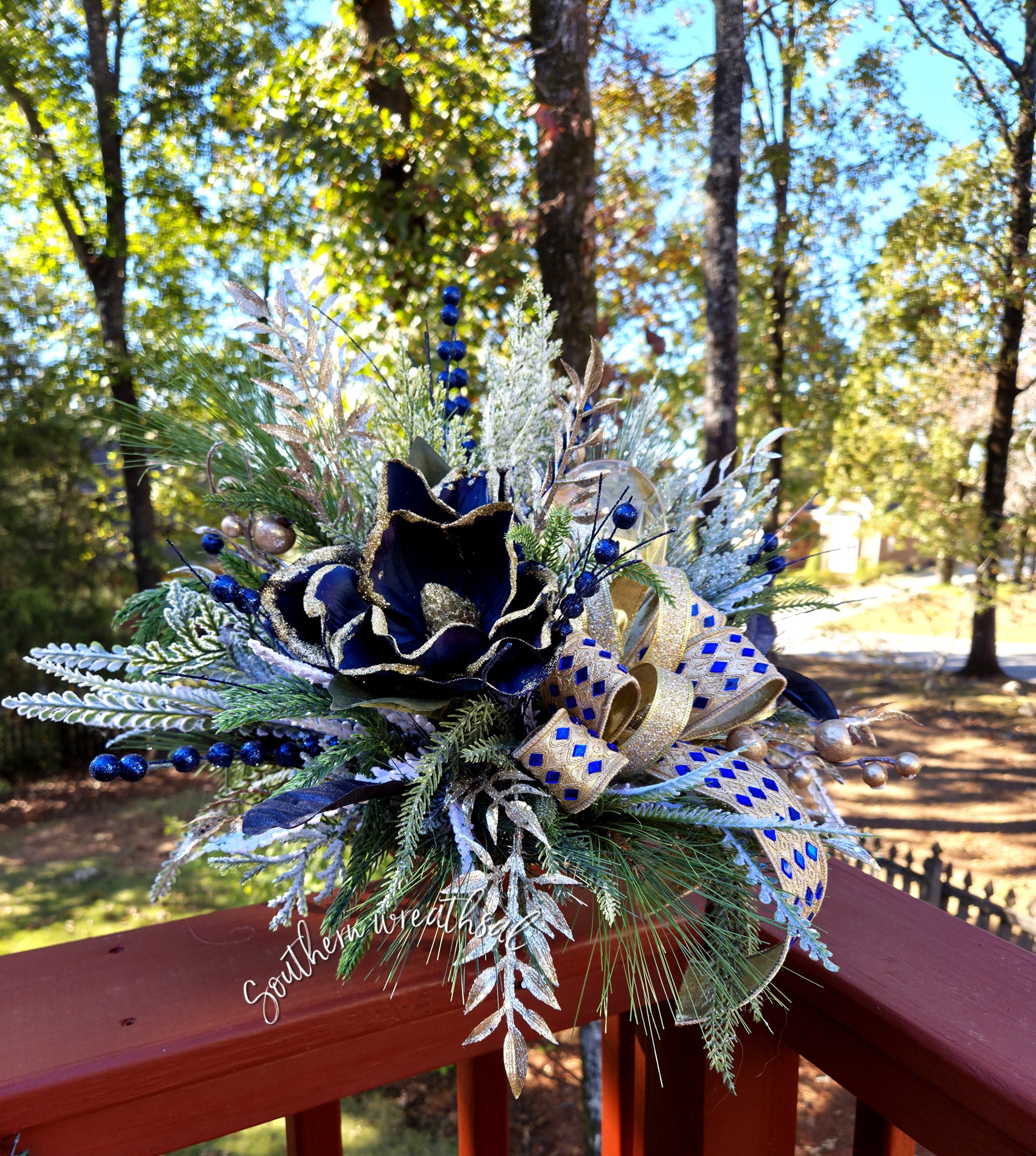 This royal blue and gold Christmas arrangement captures the magic of winter elegance in every detail. Handcrafted with premium materials, it features rich navy-blue velvet magnolias trimmed in gold, sparkling evergreen foliage, frosted cedar, and glittered gold berries .