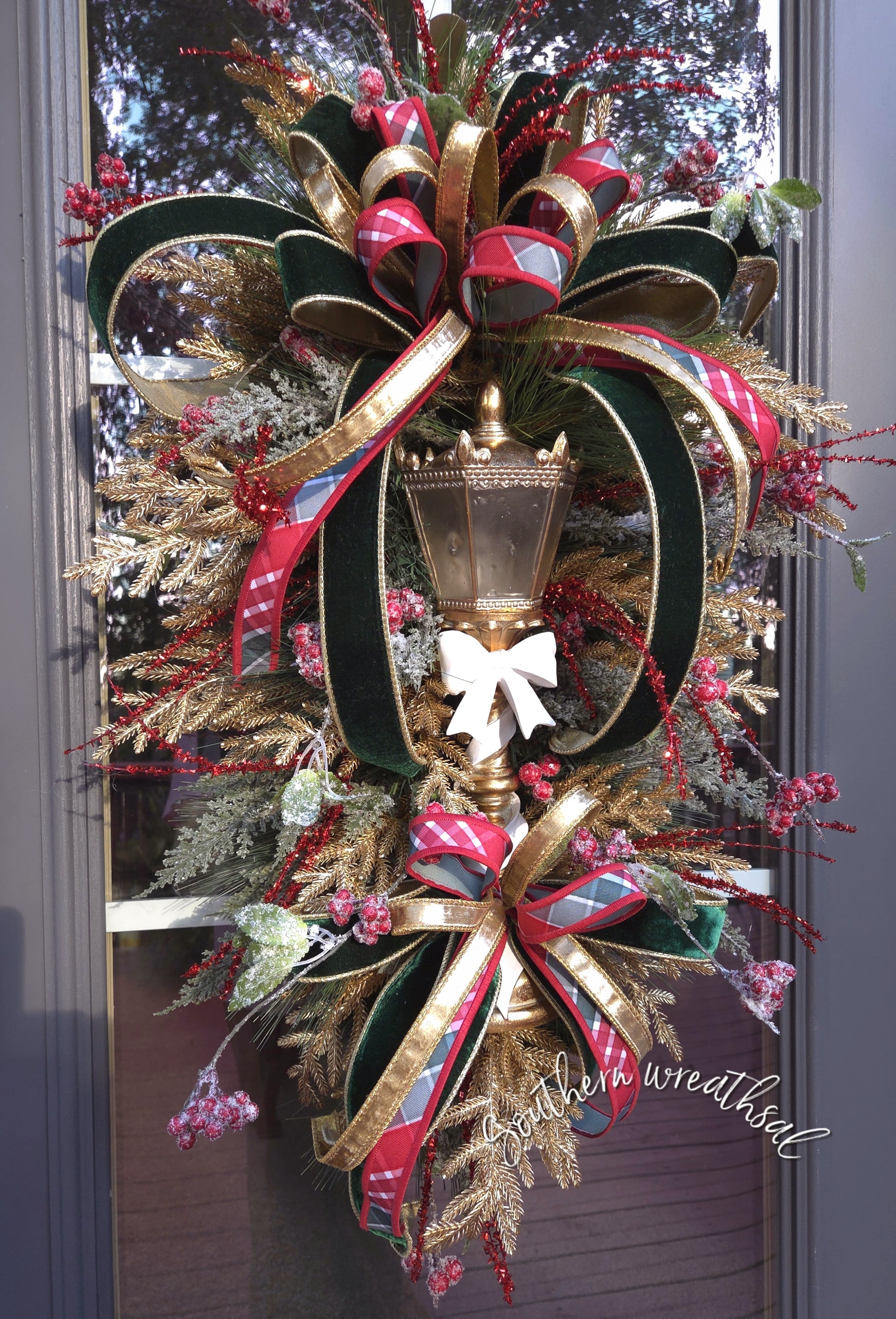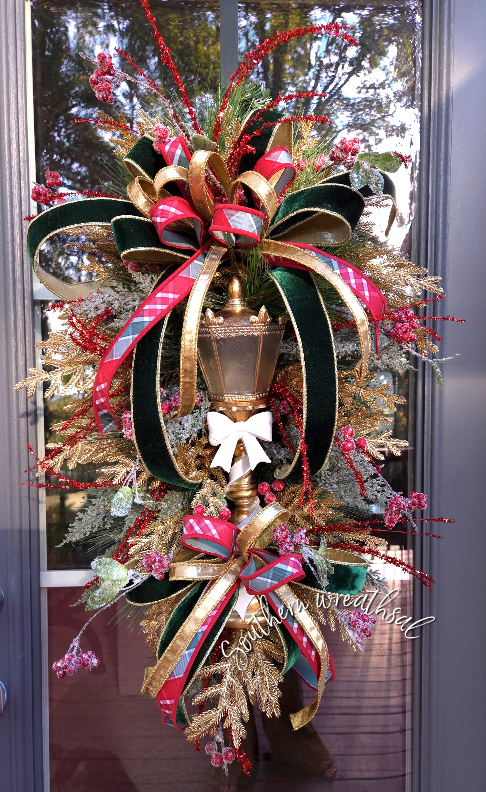 Bring timeless holiday elegance to your front door with this exquisite Christmas teardrop swag, handcrafted on a lush evergreen base. At its center glows a stunning gold lantern accented with a delicate ivory bow, creating the perfect focal point for a sophisticated seasonal display. Designer ribbons of rich emerald green velvet ribbons trimmed in gold pair beautifully with classic red plaid and shimmering metallic gold ribbon bows and loops that cascade gracefully through the design.