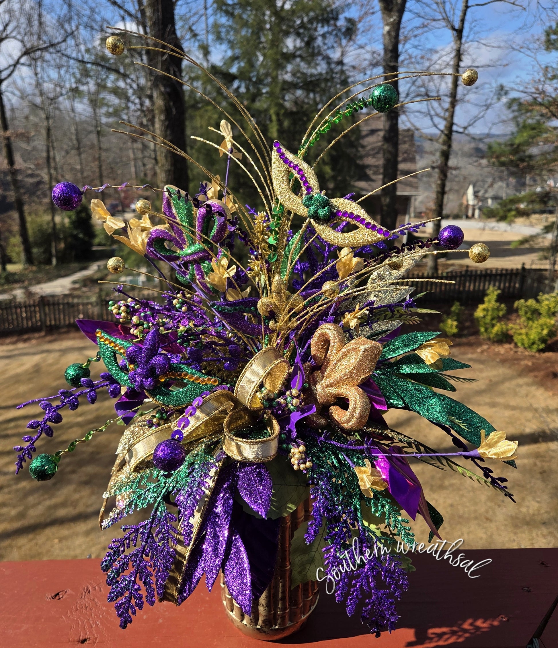 • Handmade luxury Mardi Gras centerpiece