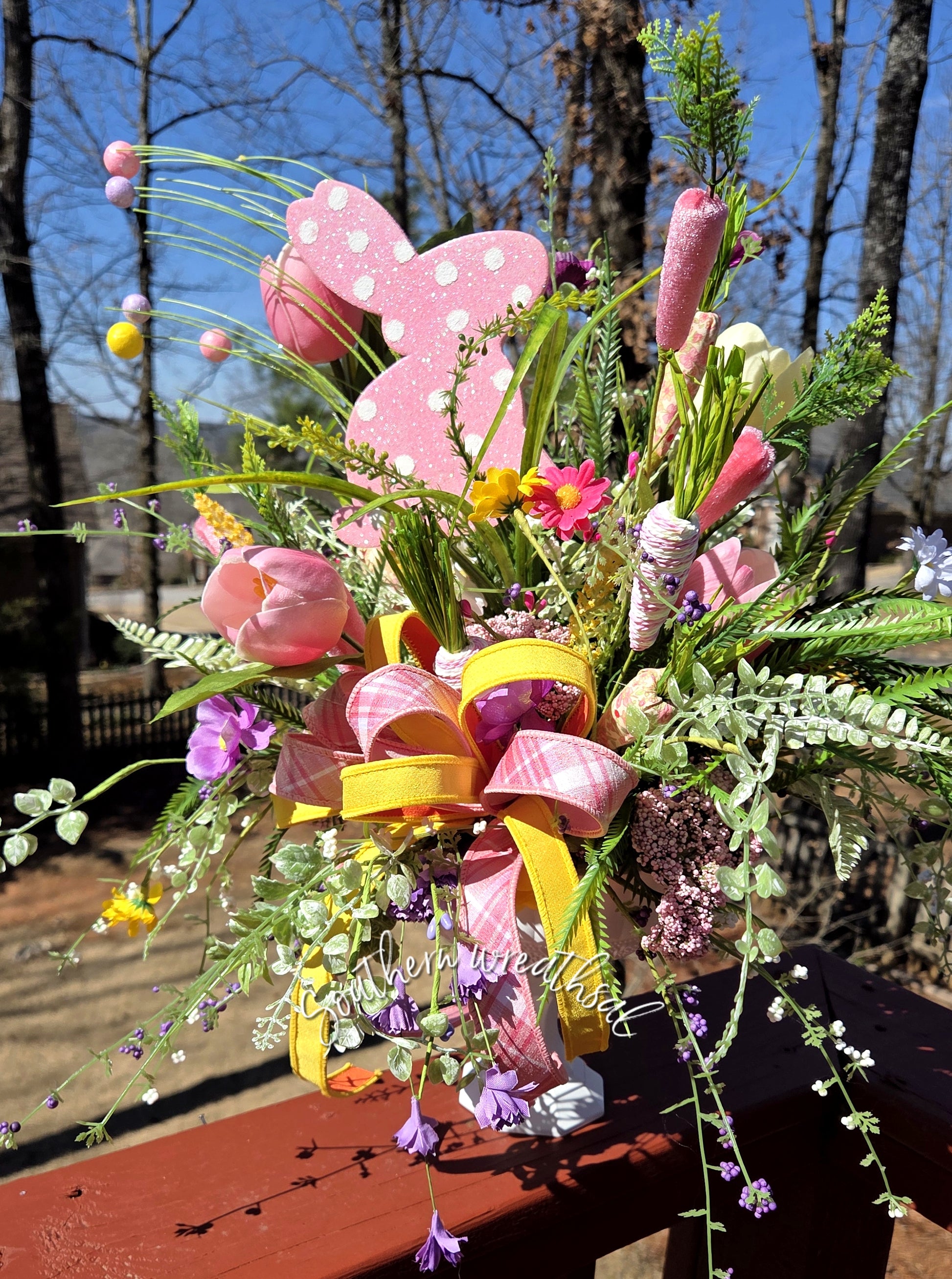 Bright pops of yellow, cheerful pinks, and designer ribbon create that perfect blend of fun and upscale Southern style. From the sweet velvet carrots to the airy trailing greenery, every angle is full, layered, and made to be noticed.