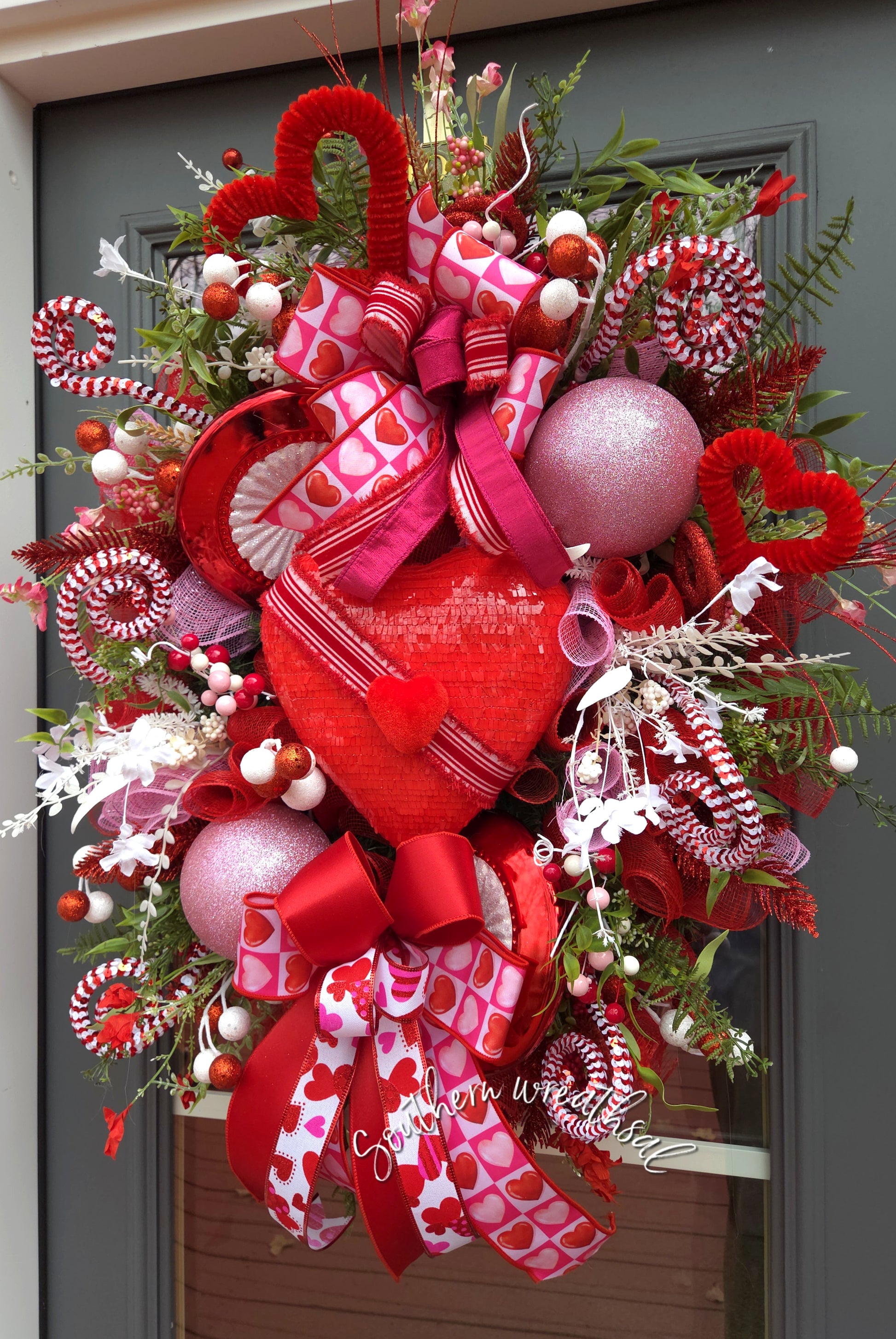 Fall head-over-heels for this over-the-top Deluxe Valentine Heart Wreath, handcrafted to make your front door the sweetest stop on the block. Designed with lush greenery, shimmering pink ornaments, plush velvet candy accents, and layers of heart-patterned designer ribbon, this wreath is centered with a statement red heart that steals the show.