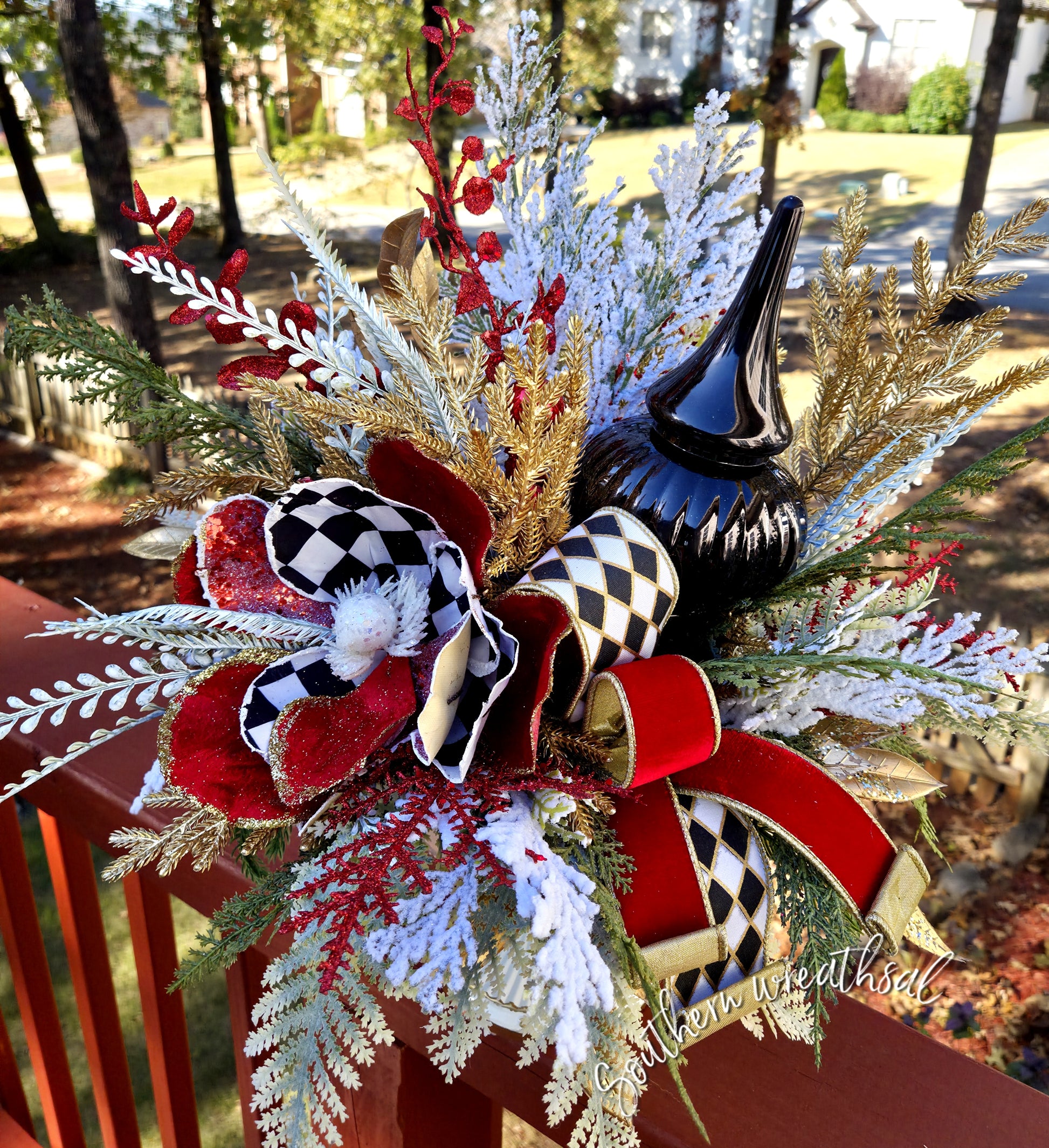 Lush red velvet Magnolia flowers shimmer with glittered edges, nestled among gold and frosted evergreen foliage and a large shiney black finial ornament. A striking black-and-white harlequin ribbon adds playful sophistication, while glittered red stems and golden fern accents create rich texture and contrast.
