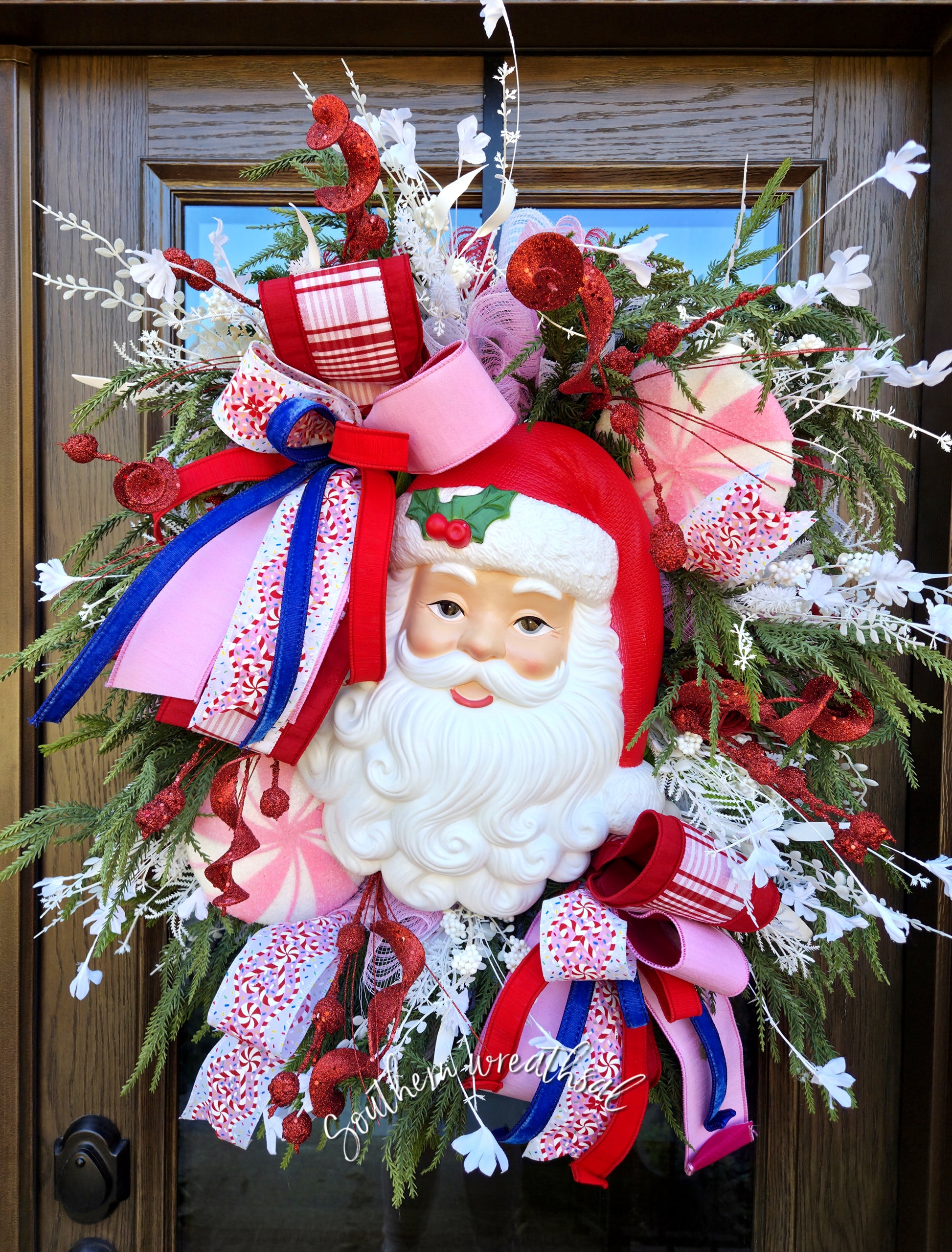 Two extra-large designer bows crafted from premium wired ribbons in shades of red, pink, white, and royal blue create a vibrant mix of color and texture, with hints of plaid and candy patterns that capture the spirit of old-fashioned Christmas. Glittered berry sprays and snowy foliage add sparkle and depth, making this wreath perfect for your front door or holiday mantel.